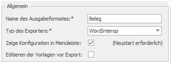 Achtung: Neu angelegte Ausgabeformate sind erst nach cobra Neustart in der Menüleiste sichtbar. Eine Aktualisierung der Menüleiste (Ribbon) ist nicht möglich.