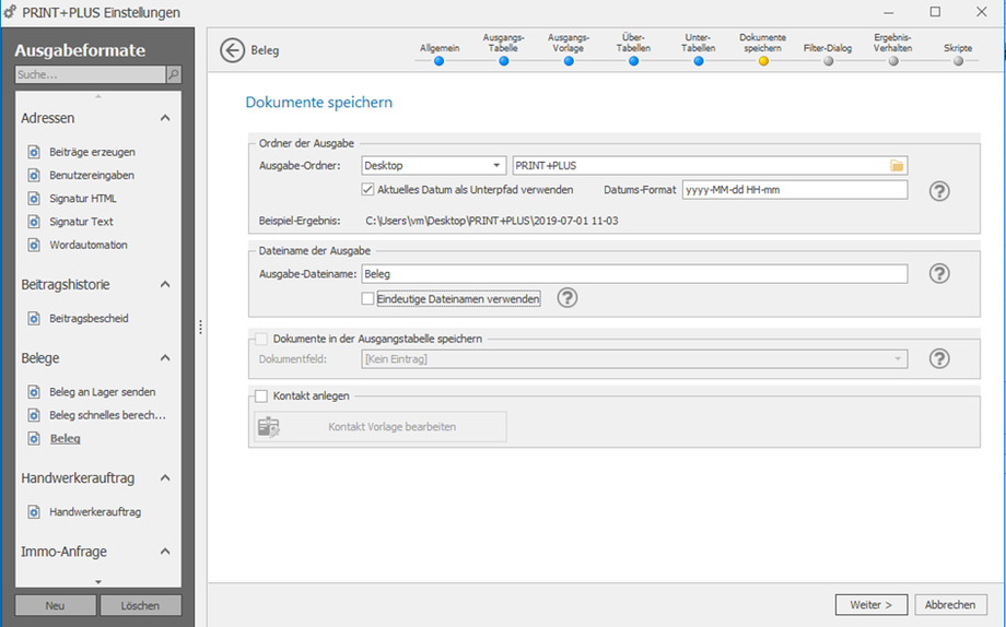Im Register „Dokumente speichern“ kann der Ausgabeordner ausgewählt werden. Es kann ebenfalls definiert werden, wie das generierte Dokument benannt werden sollen. Hierbei können auch Platzhalter verwendet werden, Beispiel: „{Adresse.Firma}_Rechnung {Rechnung.Belegnummer}“. Das Dokument kann automatisch in einem Dokumentfeld des Ausgangsdatensatzes gespeichert oder im angelegten Kontakt hinterlegt werden. Wenn kein Feld ausgewählt wurde, speichert PRINT+PLUS das Dokument im Ablageordner (standardmäßig auf dem Desktop).