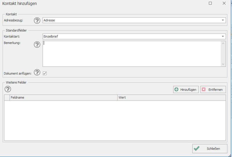 Es kann ebenfalls ein Kontakt angelegt werden, dem das Dokument angefügt werden kann. Hier muss der Adressbezug ausgewählt werden. Es kann die Kontaktart ausgewählt werden und es gibt ein Feld für Bemerkungen. Wird bei „Dokument anfügen“ ein Häkchen gesetzt, so wird das Dokument im Kontakt in das Feld Dokument angefügt.