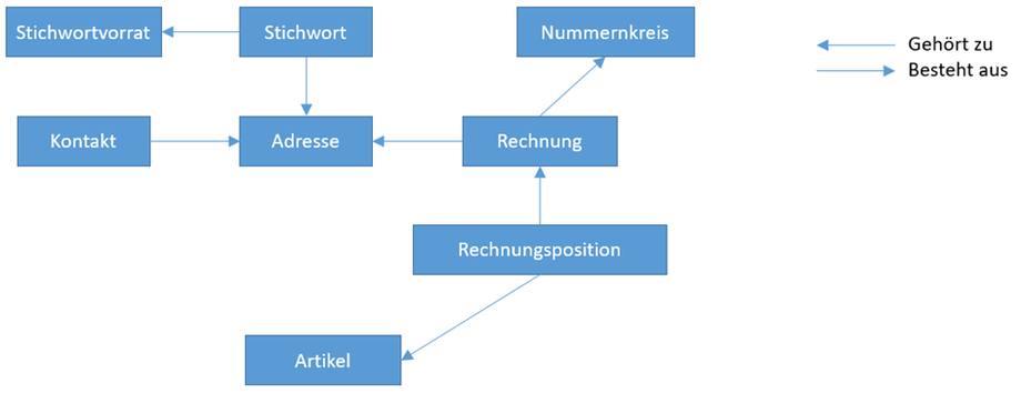 Die folgende Abbildung zeigt nochmal den kompletten Zusammenhang der Datensätze für eine Rechnung.