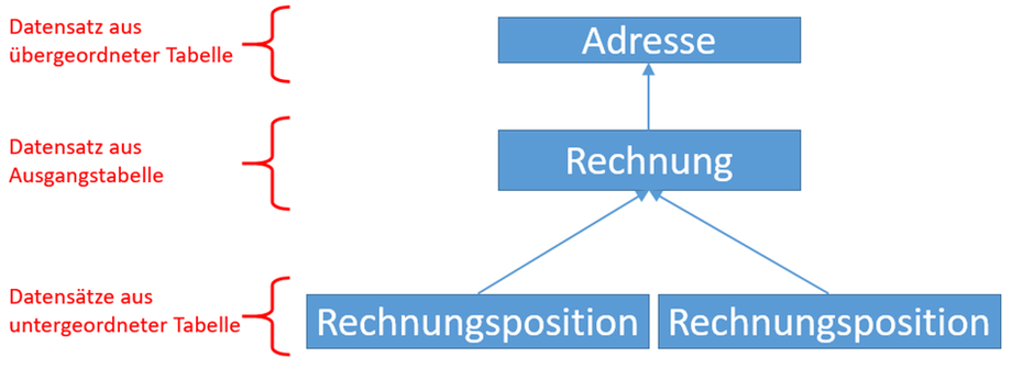 Übergeordnete Tabellen: Einem Datensatz aus der Ausgangstabelle wird genau ein Datensatz aus einer weiteren Tabelle zugeordnet. Zum Beispiel gibt es zu einer Rechnung nur einen Rechnungsempfänger. Die Tabelle „Adresse“ ist somit eine übergeordnete Tabelle von „Rechnung“.
