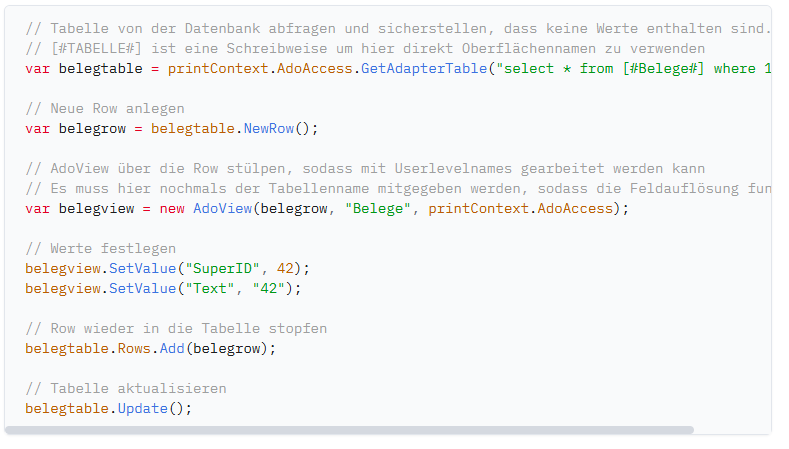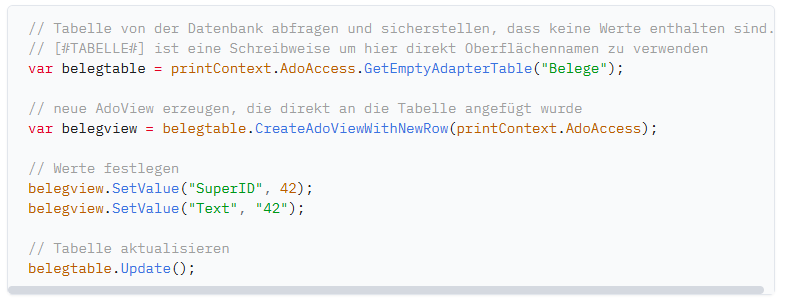 Die Klasse DataAdapterTable repräsentiert eine Tabelle, in die Datensätze eingefügt werden können und die das Zurückspeichern in die Datenbank erlaubt. (Es handelt sich dabei um eine erweiterte System.Data.DataTable)