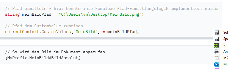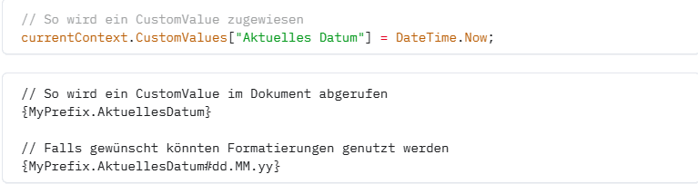 Auf CurrentContext und ChildContext gibt es eine Eigenschaft CustomValues. Diese ist ein Dictionary mit einem Namen als Key und einem beliebigen Wert als Value. Werte die hier hinzufügt werden können im Dokument mit der normalen Platzhalter-Syntax abgerufen werden. Hierbei ist wie üblich die Verwendung von Formatierungen möglich.