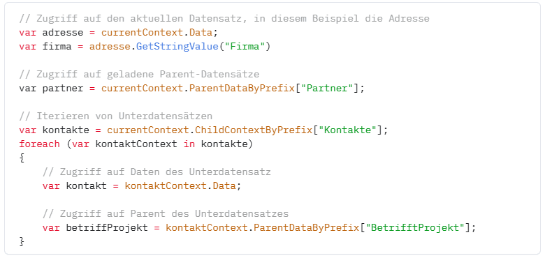 Der CurrentContext enthält direkt alle Daten des Ausgangsdatensatzes und alle (rekursiv) übergeordneten Datensätze.