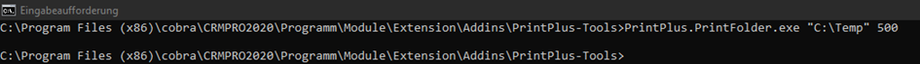 1) Sie rufen es im Command-Line-Interface direkt aus dem Ordner „PRINT+PLUS-Tools“ auf, und geben als Parameter den Ordner an, in dem sich die Word-Dokumente befinden, sowie eine Verzögerung (in Millisekunden): „PrintPlus.PrintFolder.exe "c:\temp" 500“